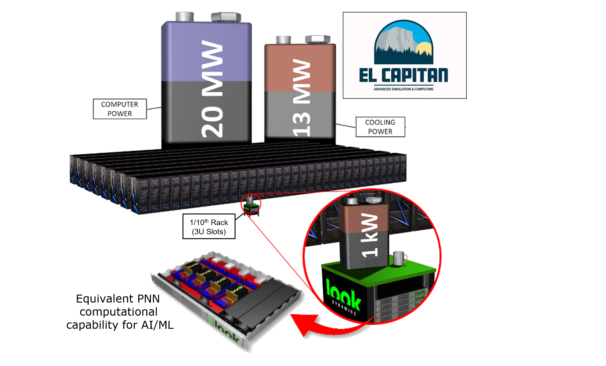 For AI computations, four Look Dynamics PNN Modules in a 1U rack tray with realistic I/O can achieve a peak performance of four exaFLOPS with a power draw of about 136 Watts including two 400G SR8 fiber transceivers.